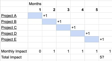 Let's assume that you’re running a team that has 5 projects and are working on them across a 6 month period. Each of them drives 1 point of value for the company, and you have an OKR to add 5 points.