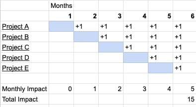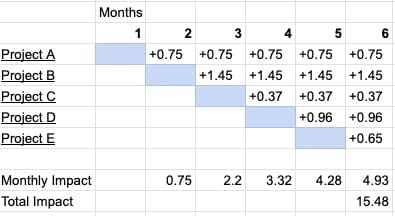 In our example, each project adds 1 “point” of value, but in reality, you’ll never know exactly how much you’ll increase a metric.