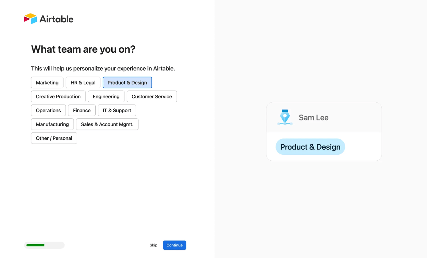 Airtable collects the role of the users, likely as they both customize the early stage experience and their product gets used on the team level primarily.